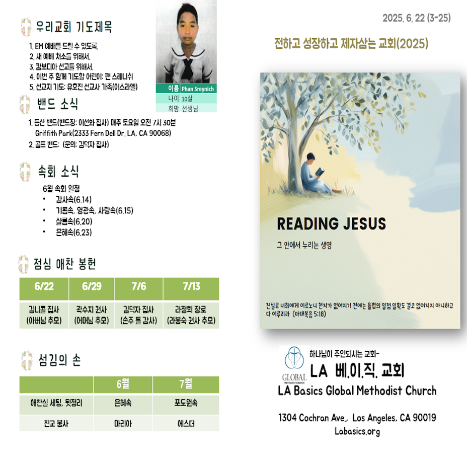 교회 광고 오디오 듣기 오늘 귀한 말씀을 전해주신 정요한 목사(시카고 아둘람 교회, 성결교)님께 감사합니다. 다음 주는 강현중 목사(주반석 교회, GMC)님께서 설교해 주십니다. 오늘 오후 2시에 부서장 회의가 회의실에서 있습니다. 오늘부터 성경공부, Reading Jesus 등록을 시작합니다. (기간: 7월 19일-9월6일, 문의: 변경희 교육부장) 토요 새벽예배 (토요일 오전 6시) 6월 6월 토요 새벽 애찬 루디아 선교회 한나…