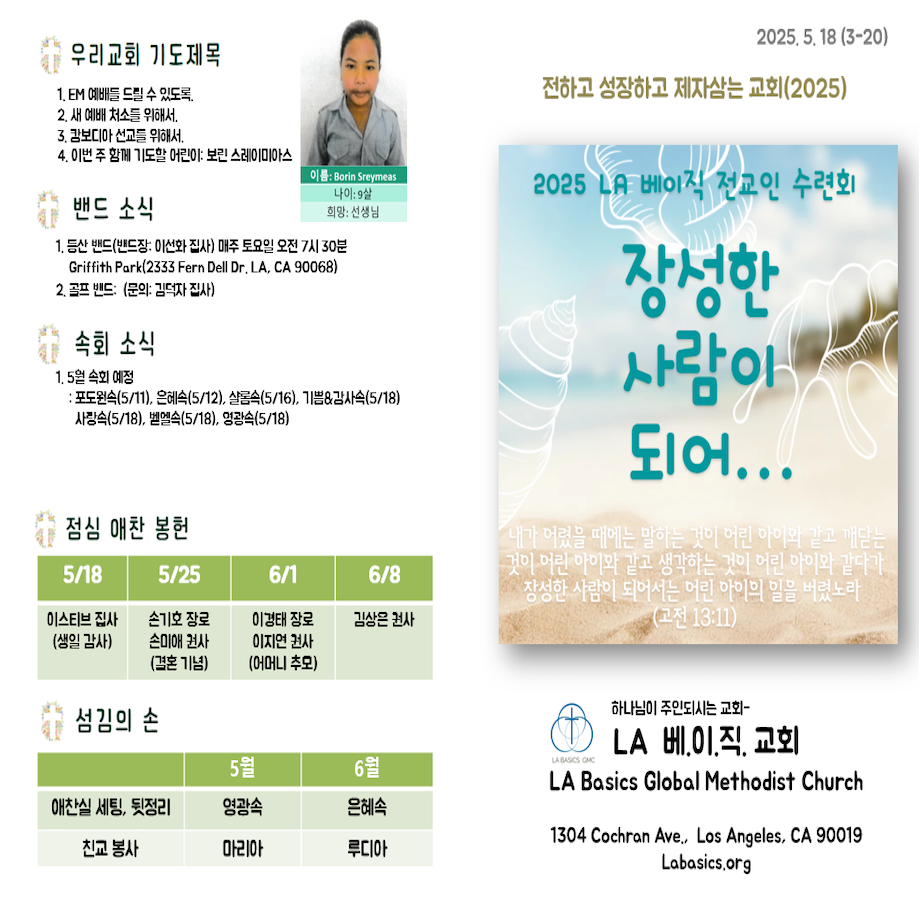 교회 광고 오디오 듣기 오늘은 제 2회 베이직 전교인 수련회로 페퍼다인 대학에서 주일 예 배를 드리며 라이브로 방송됩니다. 토요 새벽예배 (토요일 오전 6시) 5월 6월 토요 새벽 애찬 마리아 루디아 토요 새벽 특송 6/7 영광속 특송 담임 목사 동정: 6월 15일, 22일 출타합니다. 5월 31일(토) 새벽 예배 후 속장교육이 있습니다. 다가오는 행사 6/8 교회학교…