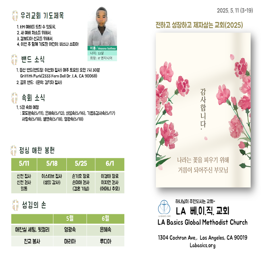 교회 광고 오디오 듣기 오늘 하나님 말씀을 전해주신 송기성 목사님(전, 나성한인감리교회 담임)께 감사합니다. 전교인 수련회 등록: 입구에 신청서가 준비되어 있습니다. (2차 마감: 514) 봄 나들이는 5월 3일(토) 오전 8:50 교회에서 출발합니다. 오늘까지 사순절 성경쓰기 노트를 제출하십시오. (변경희 교육부장) 5월 6일(화) 오후 8시에 한미연회 서부지역 지방회 화상 미팅이 있습니다. (대상자: 담임 목사, 임원 회장, 평신도…
