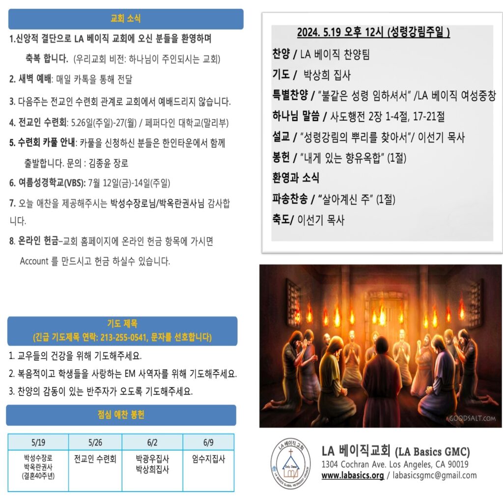 신앙적 결단으로 LA 베이직 교회에 오신 분들을 환영하며 축복 합니다. (우리교회 비전: 하나님이 주인되시는 교회) 새벽 예배: 매일 카톡을 통해 전달 다음주는 전교인 수련회 관계로 교회에서 예배드리지 않습니다. 전교인 수련회: 5.26일(주일)-27(월) / 페퍼다인 대학교(말리부) 수련회 카풀 안내: 카풀을 신청하신 분들은 한인타운에서 함께 출발합니다. 문의 : 김종윤 장로 여름성경학교(VBS): 7월 12일(금)-14일(주일) 애찬감사: 오늘 애찬을 제공해주시는 박성수장로님/박옥란권사님…