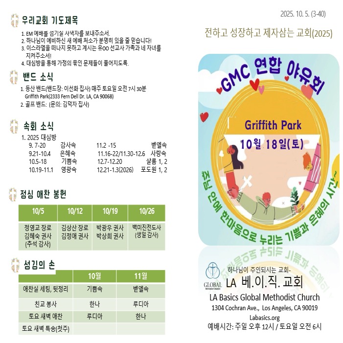 교회 광고 오디오 듣기 정운용 목사님이 베이직 교회 가족이 되었습니다. 환영합니다. (가족: 이지현사모, 정로하, 정로희) 속회별 대심방이 은혜롭게 진행중입니다. (문의: 정캐롤 권사) 리딩지저스1 2oom 반이 매주 화요일 저녁 7시 30분에 진행중입니다 (문의: 변경희 권사) 서부지방 전교인 야유회가 그리피스 에서 10월 18일(토) 오전 10시에 있습니다. 종교개혁주일 기념 서부지방 연합 부흥회가 10월 24일(금, 생수 의 강),…