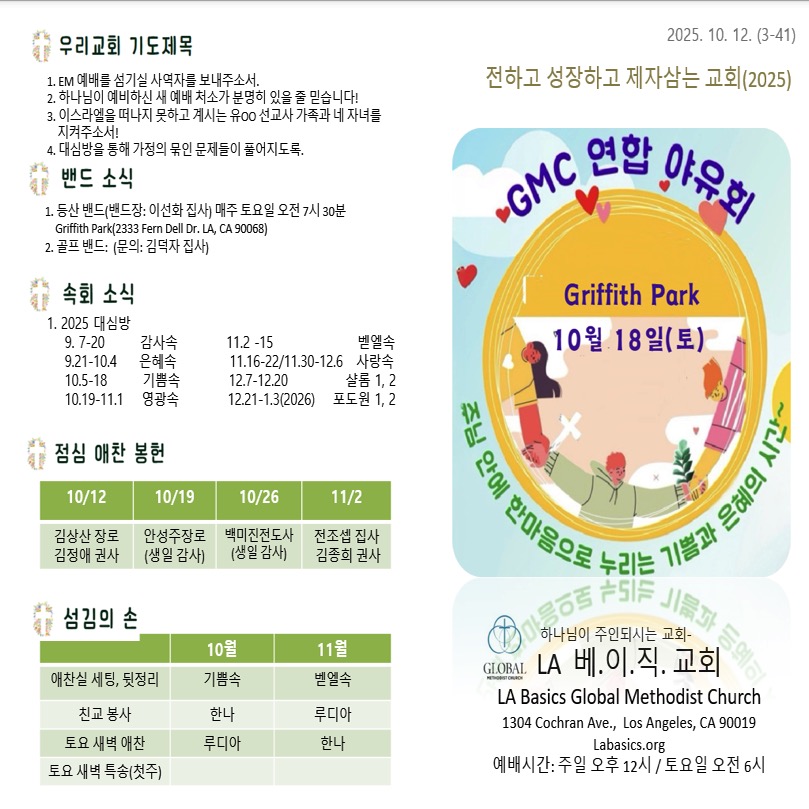 교회 광고 오디오 듣기 매주 토요일 새벽 예배 실시간 방송을 하고 있습니다. 카톡으로 전달되는 링크를 통해 참여하실 수 있습니다. 속회별 대심방이 은혜롭게 진행중입니다. (문의: 정캐롤 속회부장) 리딩지저스1 2oom 반이 매주 화요일 저녁 7시 30분에 진행중입니다 (문의: 변경희 교육부장) 서부지방 전교인 야유회가 그리피스 에서 10월 18일(토) 오전 10시에 있으며, 일일 선교 바자를 위해 미사용한 물건을…