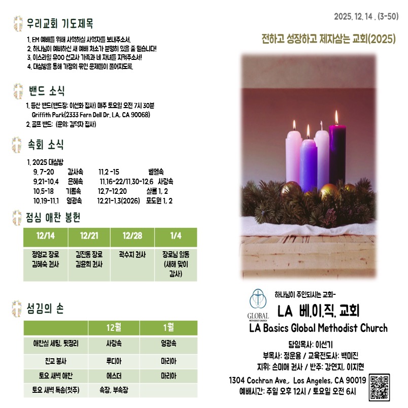 교회 광고 오디오 듣기 오늘은 성탄주일입니다. 세례받으시는 백지희 자매님 축하합니다. 오늘 여선교회에서 부추가래떡을 판매합니다. 오늘 오후 2시 구역회가 본당에서 있습니다. 12월 26일(금)-28일(주일) 중고등부 수련회가 하와이 로뎀 글로벌 감리교회에서 있습니다. 12월 28일(주일)에 문화사역부가 주관하고 남선교회가 후원하는 전교인 윷놀이와 송구영신예배가 있으며 상품으로 사용될 새 물건 및 도네이션을 받습니다. (문의: 박광애 문화사역부장) 리딩 지저스 성경공부반이 곧 시작됩니다.…