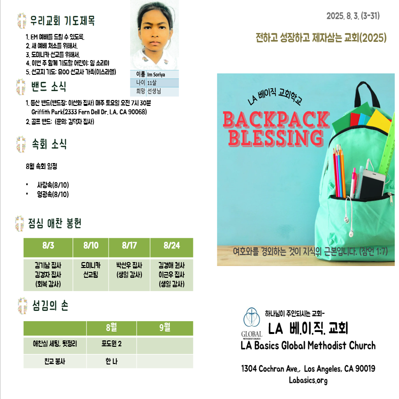 교회 광고 오디오 듣기 GMC 한미연회 도미니카 공화국 선교를 은혜가운데 마쳤으며, 이를 위해 중보기도와 후원해 주신 모든 분들께 감사드립니다. 오늘 홍수 피해 구호 헌금은 텍사스 홍수피해 지역과 한국 가평 지역 감리교회 위해 쓰여집니다. 오늘은 Backpack Blessing 주일로 교회학교 학생들의 새학기를 축복합니다. 친교부와 여선교회에서 매주 반찬 바자를 실시하며 수익금은 교회 예배처소 헌금으로 드려집니다. (메뉴: 불고기,…