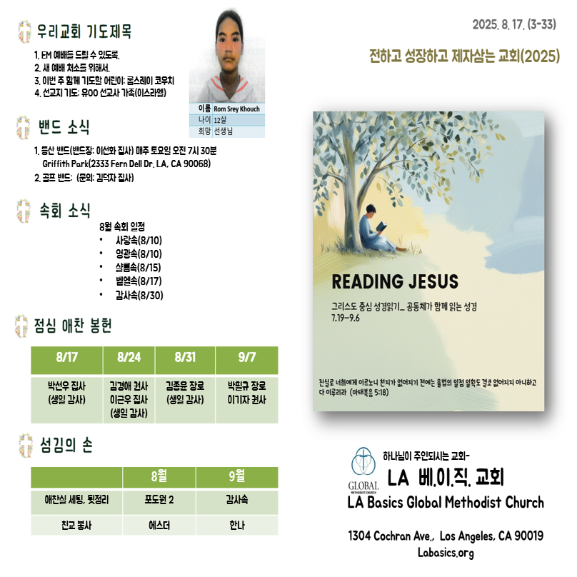 교회 광고 오디오 듣기 9월 속회는 연합 속회로 14일 (주일) 예배 후 야외에서 모입니다. 장소는 곧 공지됩니다. 친교부와 여선교회에서 매주 반찬 바자를 실시하며 수익금은 교회 예배처소 헌금으로 드려집니다. (메뉴: 포기김치, 막김치, 불고기, 제육, 고등어 구이, 조개젓 외) 다가오는 행사 7/19(토)-9/6(토) . Bible Study – Reading Jesus 8/31(주일)-9/1(월) 교회학교 가족 및 청,장년부 수련회 토요 새벽예배…