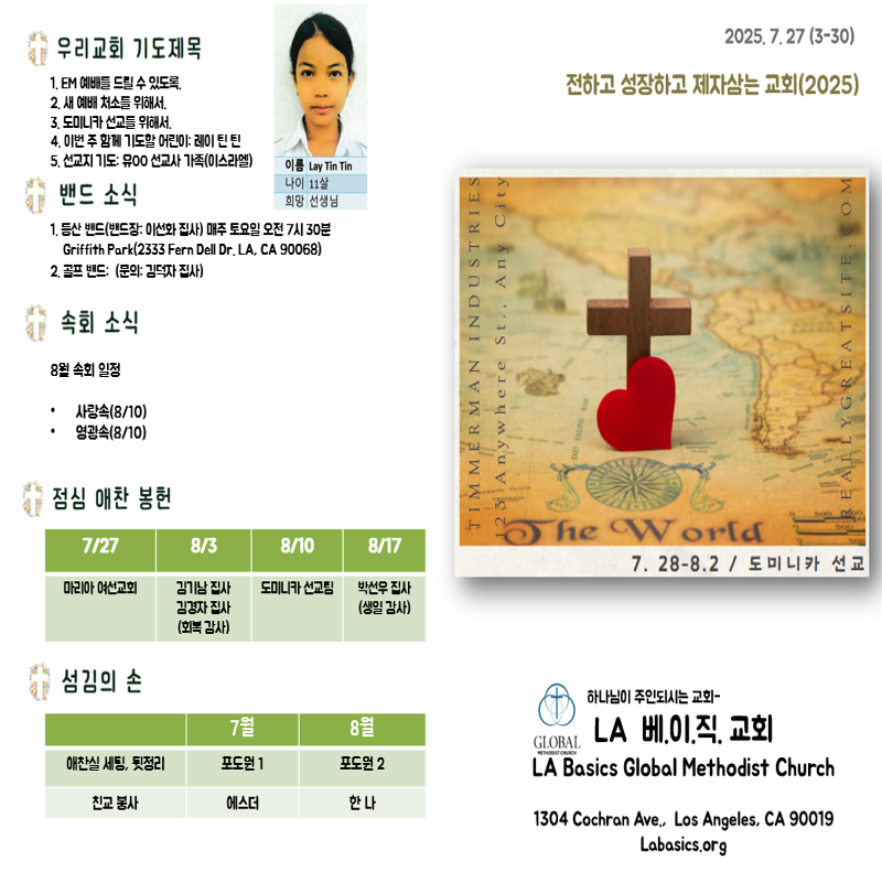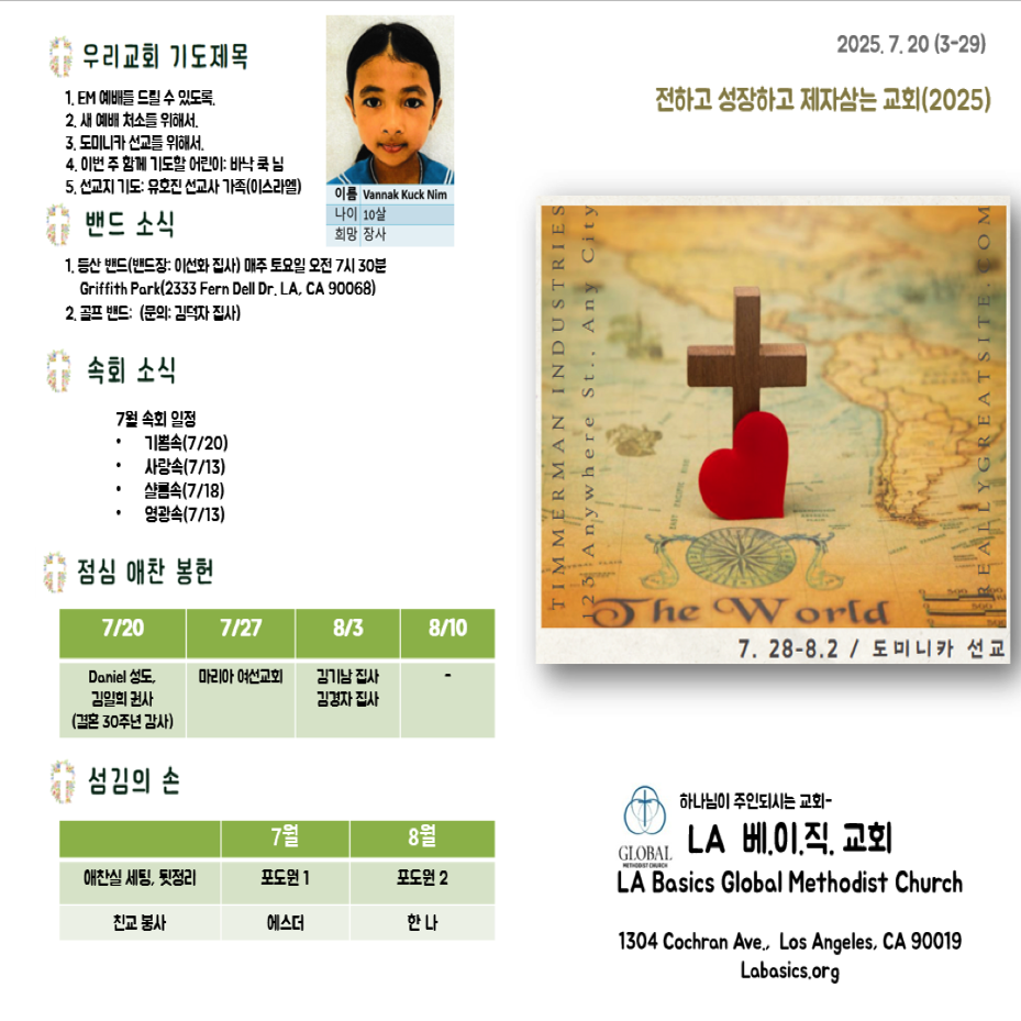 교회 광고 오디오 듣기 오늘 밤에 도미니카 선교팀이 출발합니다. 아울러 7월 28일 (월)-8월1일(금) 매주 오후 9시에 선교를 위한 중보기도 모임 200m이 있습니다. (Zoom 주소: 642 130 7807/100100) 친교부와 여선교회에서 매주 반찬 바자를 실시하며 수익금은 교회 예배처소 헌금으로 드려집니다. (오늘의 메뉴: 진미채.멸치볶음, 파김치, 오이소박이) 다음 주일에는 텍사스와 한국의 홍수 피해 구호헌금을 드립 니다. 다가오는 행사…