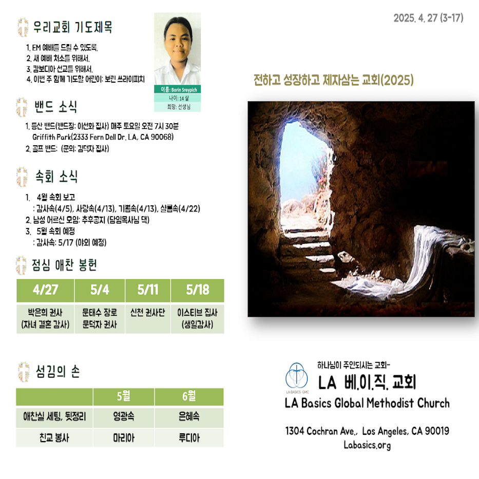 교회 광고 오디오 듣기 오늘 하나님 말씀을 전해주신 송기성 목사님(전, 나성한인감리교회 담임)께 감사합니다. 전교인 수련회 등록: 입구에 신청서가 준비되어 있습니다. (2차 마감: 514) 봄 나들이는 5월 3일(토) 오전 8:50 교회에서 출발합니다. 오늘까지 사순절 성경쓰기 노트를 제출하십시오. (변경희 교육부장) 5월 6일(화) 오후 8시에 한미연회 서부지역 지방회 화상 미팅이 있습니다. (대상자: 담임 목사, 임원 회장, 평신도…