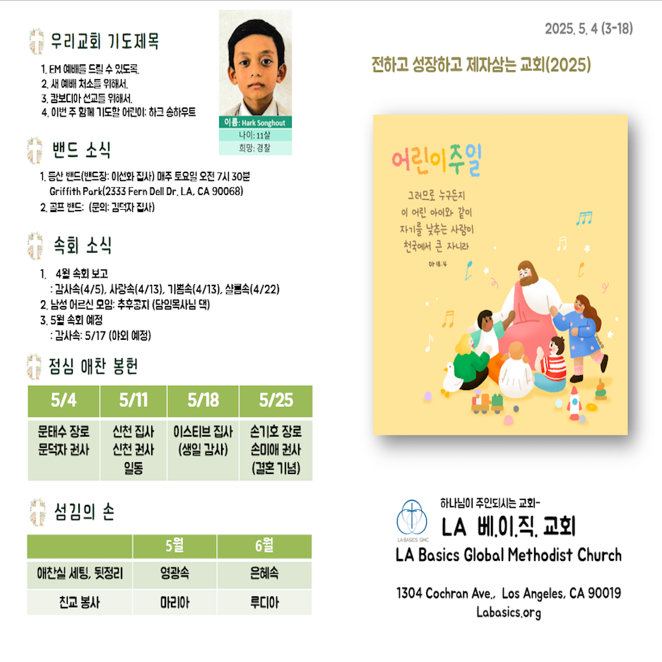 교회 광고 오디오 듣기 오늘은 어린이 주일입니다. 우리 교회 어린이들을 축복합니다. 박로빈, 박엘린, 김가영, 이가은, 박아일린, 김승환, 김아영, 김하루 전교인 수련회 등록이 오늘 마감되며, 주일예배만 드리는 경우라도 반드시 등록하셔야 합니다. 5월 6일(화) 오후 8시에 한미연회 서부지역 지방회 화상 미팅이 있 습니다. (대상자: 담임 목사, 임원 회장, 평신도 대표, 연회 대표, 서 부지방 남/여 연합회…