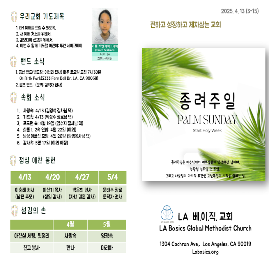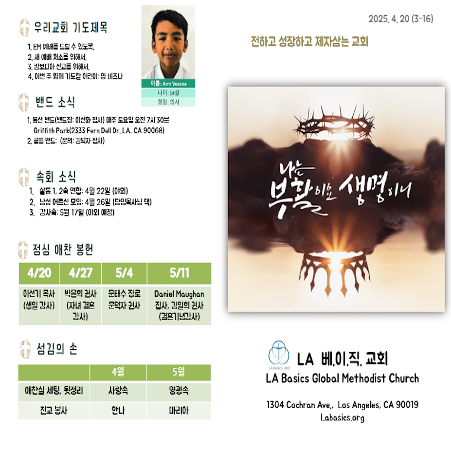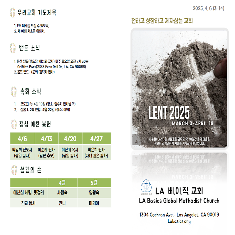 교회 광고 오디오 듣기 오늘은 부활주일로 신천 권사. 신천 집사 임직식이 있습니다. *신천 집사: 김홍후. 윤미나 *신천 권사: 김일희, 박광애, 박광우, 박상희, 원정덕 다음 주일 오후 2시 10분에 도미니카 단기선교팀 기도회가 회의실에서 있습니다. 다음 주일은 송기성 목사님(전, 나성한인감리교회 담임)께서 설교하십니다. 속장을 통해 봄나들이 참석 여부와 비용($50)을 납부해 주십시오. 전교인 수련회 등록: 입구에 신청서가 준비되어…