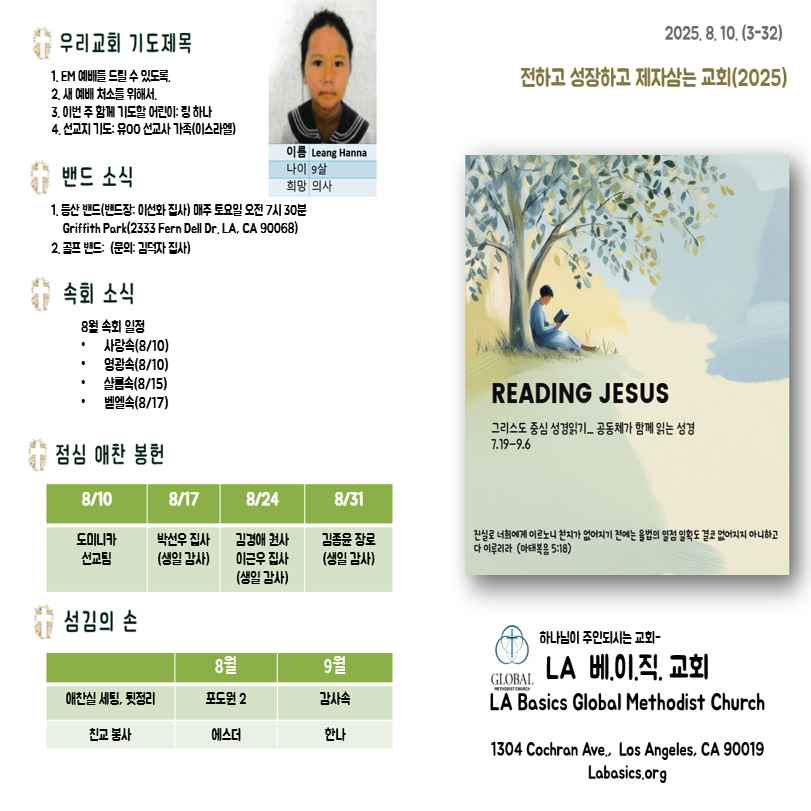 교회 광고 오디오 듣기 9월 속회는 연합 속회로 14일 (주일) 예배 후 야외에서 모입니다. 장소는 곧 공지됩니다. 친교부와 여선교회에서 매주 반찬 바자를 실시하며 수익금은 교회 예배처소 헌금으로 드려집니다. (메뉴: 포기김치, 막김치, 불고기, 제육, 고등어 구이, 조개젓 외) 다가오는 행사 7/19(토)-9/6(토) . Bible Study – Reading Jesus 8/31(주일)-9/1(월) 교회학교 가족 및 청,장년부 수련회 토요 새벽예배…