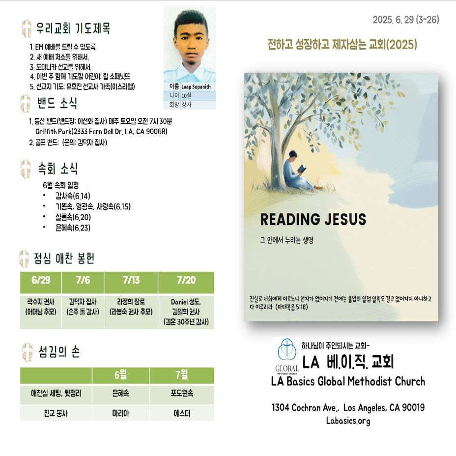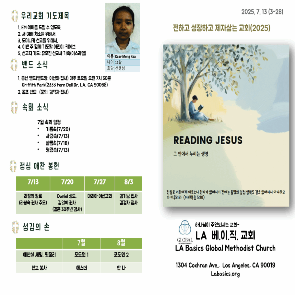 교회 광고 오디오 듣기 2025 VBS(여름성경학교)를 7개 교회 연합으로 잘 마졌습니다. 성경공부, Reading Jesus 첫 모임 관련 안내는 다음과 같습니다. – 7월 19일 오전10시, 백미진 전도사 사무실(3310 Beverly Blvd.) – 파킹: 7대 가능. Street parking 가능 친교부와 여선교회에서 매주 반찬바자를 실시하며 수익금은 교회 예배처소 헌금으로 드려집니다. (오늘의 메뉴: 된장, 고추장) 2025년 하반기 속회가 새롭게…
